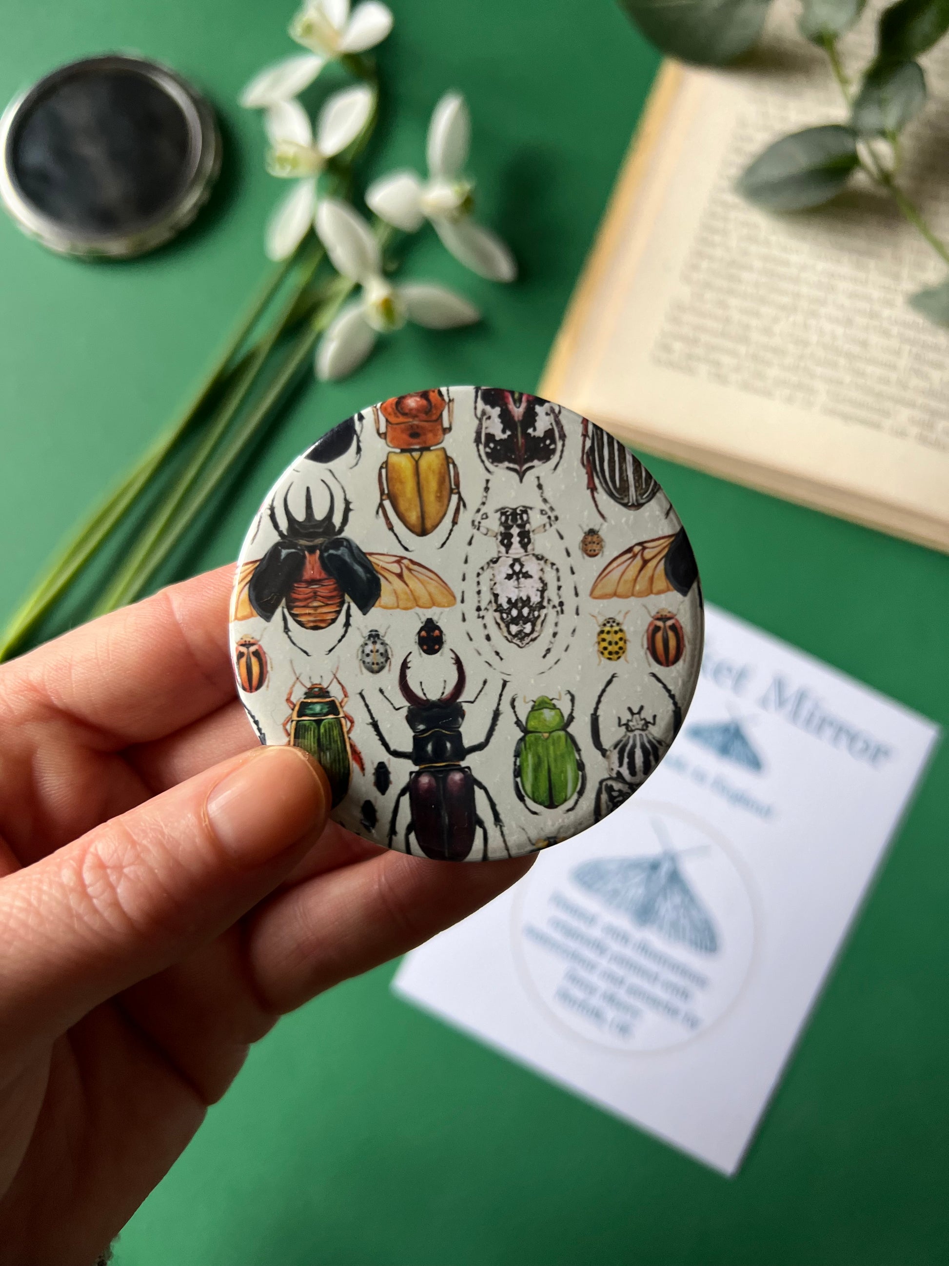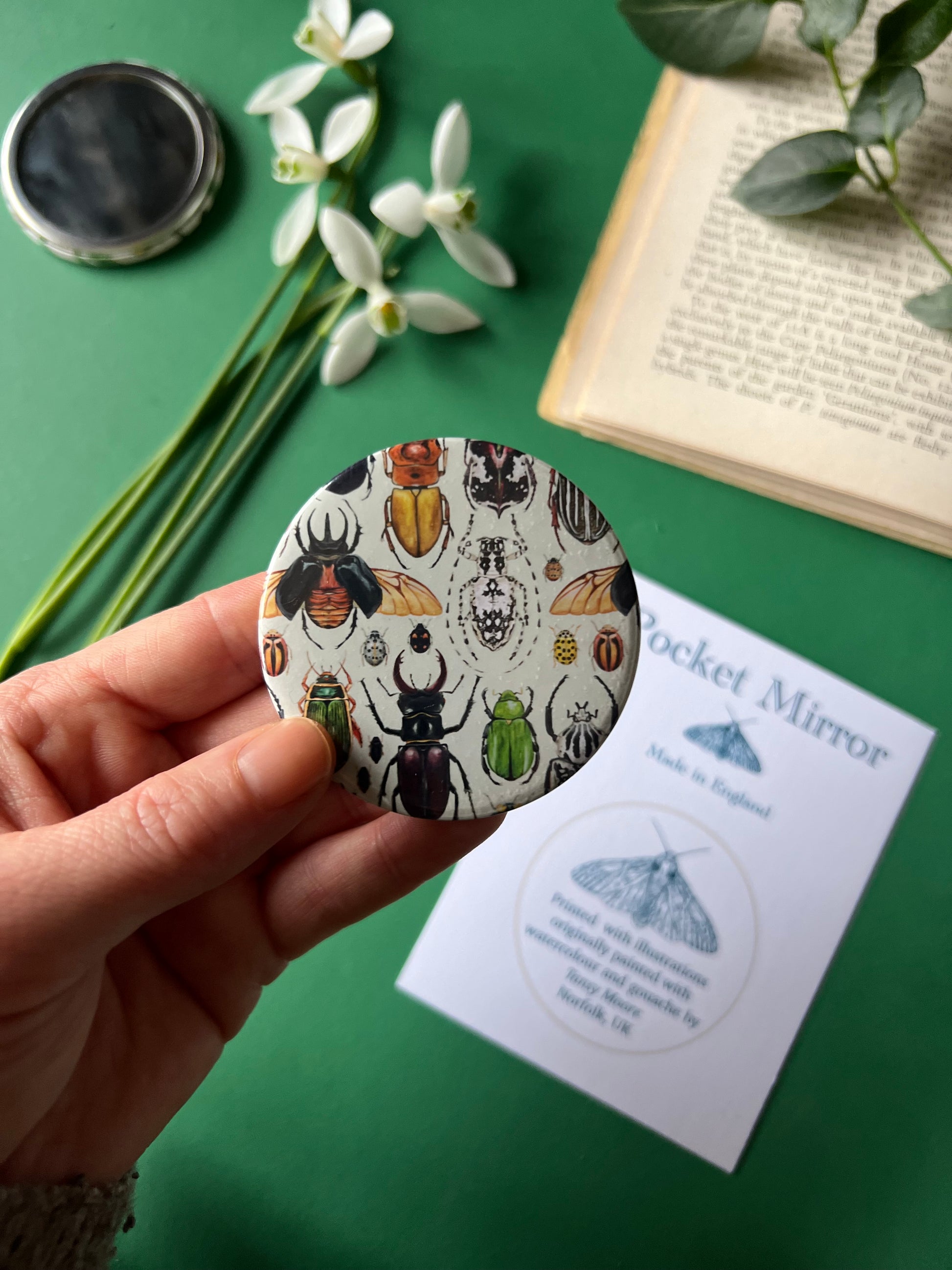 Pocket mirrors are all printed and individually made at my home in North Norfolk, Uk.